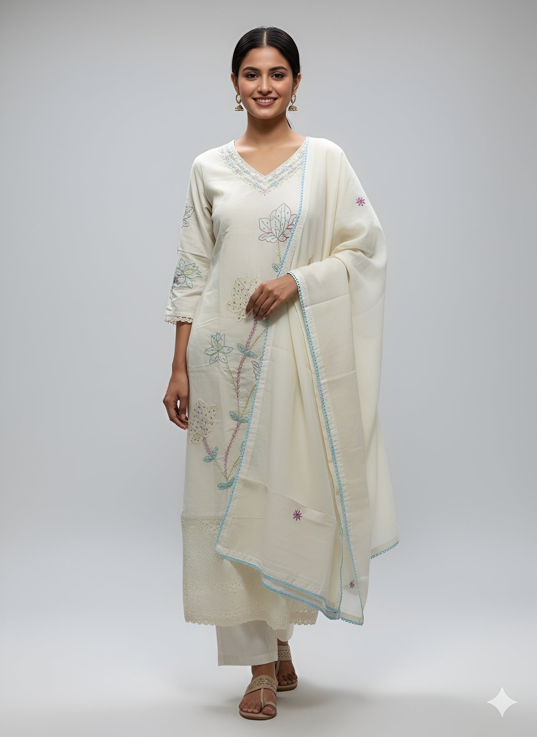 Pure Cotton Hand Embroidered Kurti Pant with Dupatta